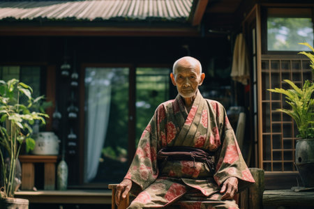 Thoughtful elderly man in a kimono, seated peacefully in a japanese garden setting
