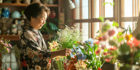 a Japanese woman decorating her living space with fresh flowers and traditional art