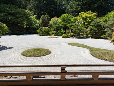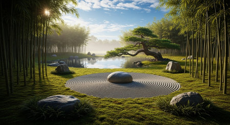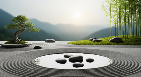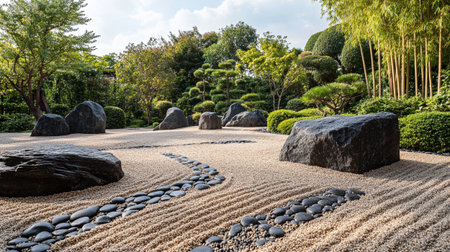 Tranquil zen rock garden with circular patterns in white sand, serene japanese landscape