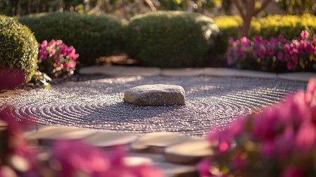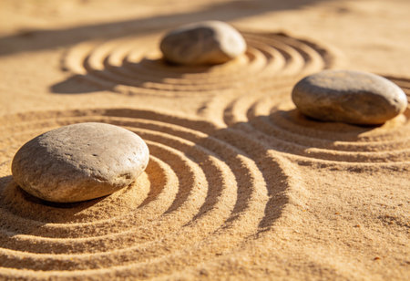 Experience the peaceful beauty of a Zen Garden with sand circles and smooth stones. Tranquil Zen garden featuring meticulously arranged sand circles surrounded by smooth, round stones.