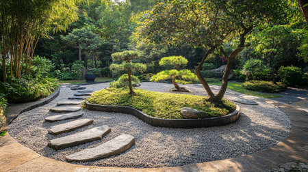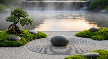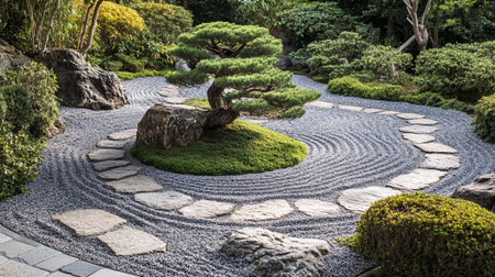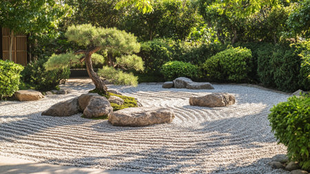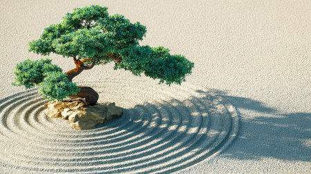 A peaceful Zen-inspired landscape featuring a gentle, calming tree amidst precisely patterned gravel, evoking harmony and mindfulness.