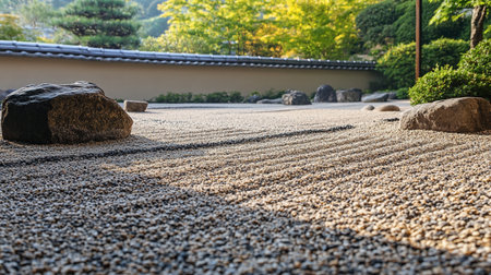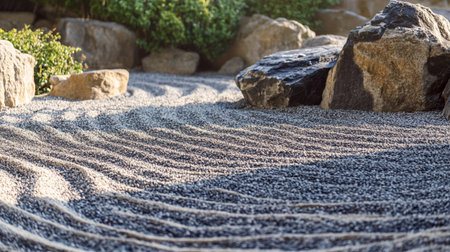 Serene zen garden with smooth stones and sand patterns.