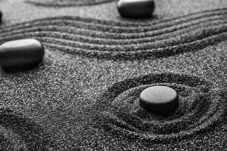 Black sand with stones and beautiful pattern. Zen concept