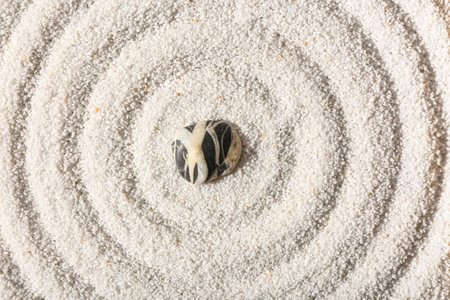 zen garden meditation stone in sand and wave pattern, zen concept