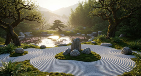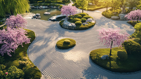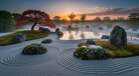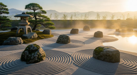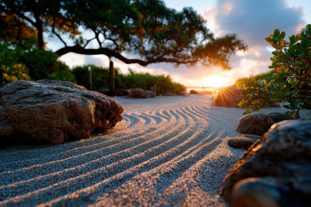 A tranquil zen garden with raked sand and rocks at sunset