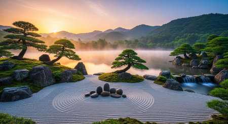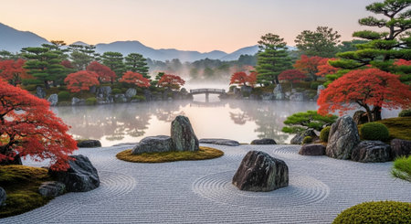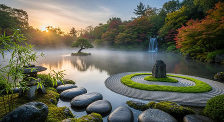 A serene Japanese garden at sunrise.