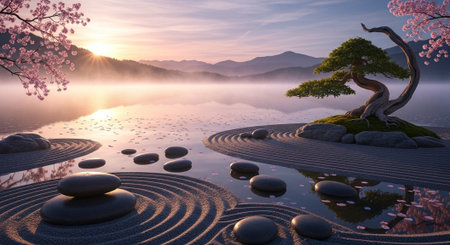 japanese zen garden in the morning mist 3d render