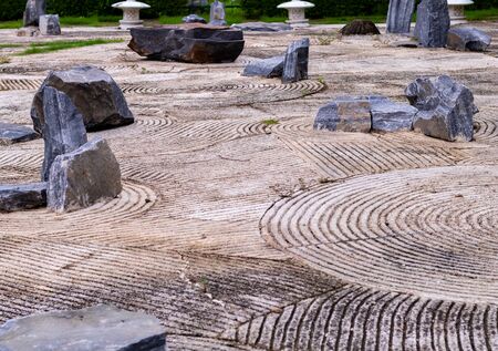 Japanese garden with small stones in the sun. Selective focus.