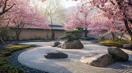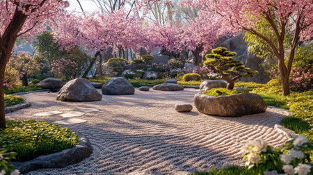 Japanese zen garden with blooming cherry blossoms - 3D render