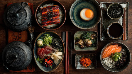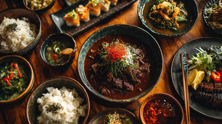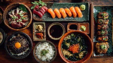Indulge in a vibrant spread of authentic Japanese cuisine featuring various sushi, sashimi, ramen, and side dishes on a rustic wooden table, inviting culinary exploration.