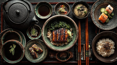 This stunning image captures an elegant arrangement of traditional Japanese cuisine, showcasing grilled fish, rice, vegetables, and tea. Perfect for culinary enthusiasts.