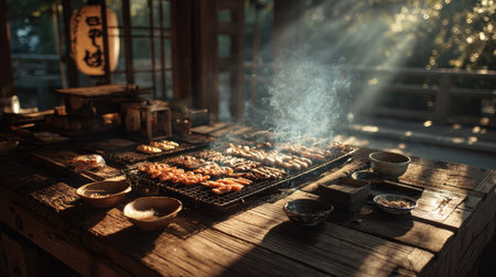 A beautiful arrangement of grilled seafood and meats on a charcoal barbecue surrounded by smoke and natural light, creating a captivating outdoor dining experience.