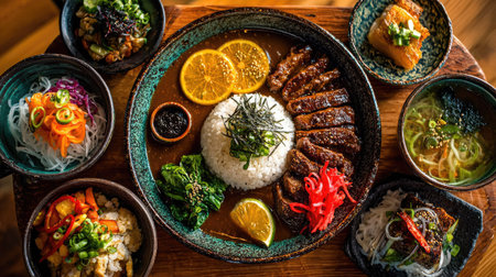 Explore the vibrant essence of Asian cuisine with a beautifully arranged meal featuring noodles, meat, rice, and fresh vegetables on a rustic table.