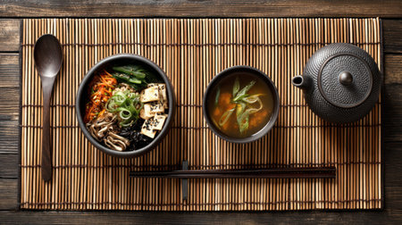 Japanese dish with a bowl of noodles topped with vegetables and tofu, alongside a soup and a teapot, arranged on a bamboo mat