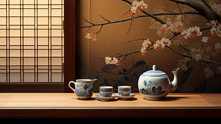 Traditional Japanese Interior with Tatami Mats, Tea Pot, and Serene Atmosphere.