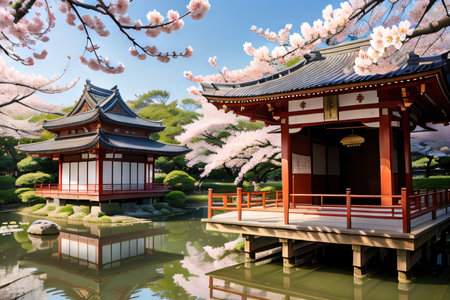 Discover a tranquil Japanese garden featuring elegant architecture, cherry blossoms, and lush greenery, perfectly reflecting on a serene pond during golden hour.