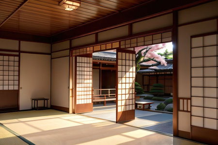 A high-resolution photo of the interior of a Japanese house, showcasing tatami mats, low wooden furniture, and a minimalist aesthetic with sliding doors and natural light.