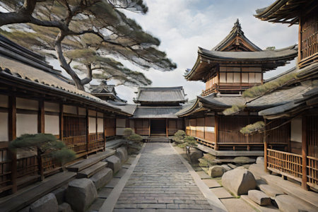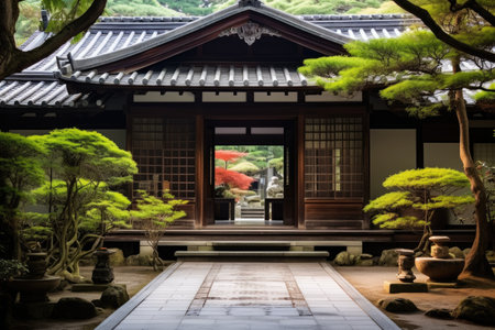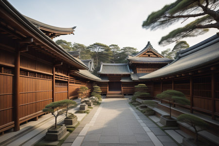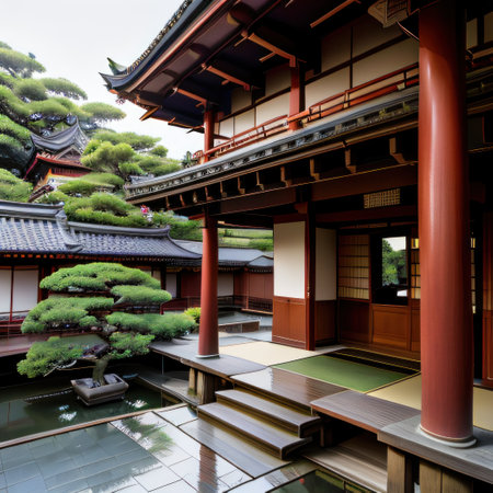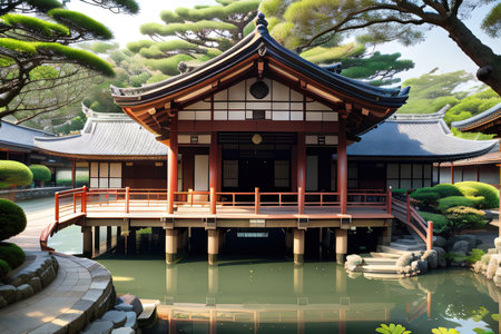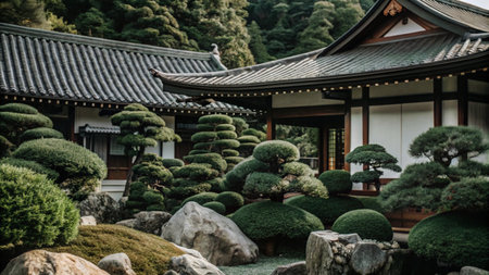 An AI generated illustration of an Asian building surrounded by a zen garden with ornamental trees