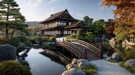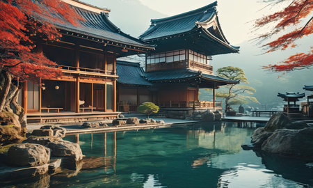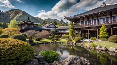 Tranquil Japanese garden with traditional architecture, pond, and lush greenery.