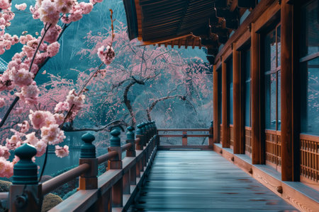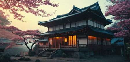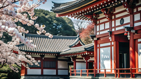 A traditional Japanese temple with cherry blossoms in bloom. (1)