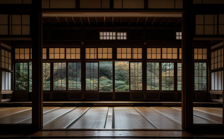 Engawa house, Japanese style. Empty room with wooden floors and windows. Generative AI.An empty room with wooden floors and large windows. Generative AI.