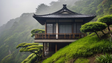 Traditional Japanese house features a steep roof and wooden balcony overlooking a dense, misty hillside filled with well-maintained greenery and trees.