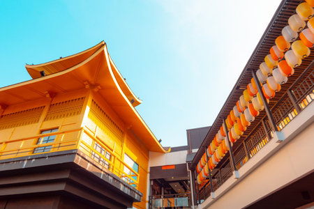 Infrared photography, a golden hue and a Japanese traditional architectural style with blue sky