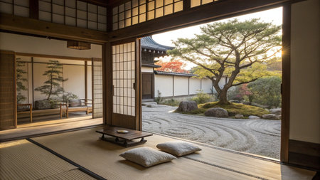 A serene Japanese interior showcasing a garden view. The traditional wooden construction and natural light create a calming ambiance perfect for relaxation.