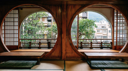 This image captures the tranquil beauty of a traditional Japanese room featuring circular windows that frame a serene outdoor landscape, showcasing harmony.