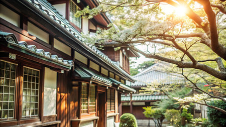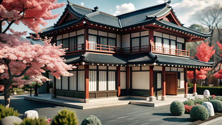 A traditional Japanese house with a beautiful garden and cherry blossom trees.