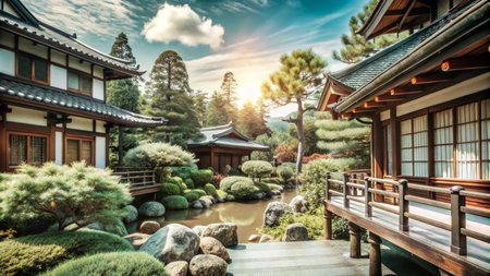 This image captures a tranquil Japanese garden featuring lyrical wooden architecture, lush greenery, and peaceful pathways, inviting relaxation.