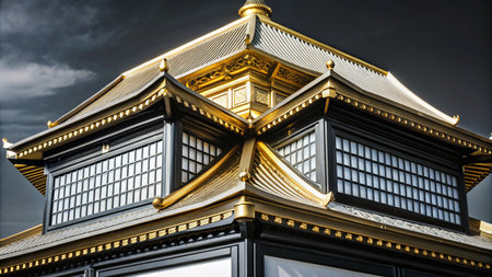 Close-up view of a golden roof with black trim and windows on a traditional pagoda.