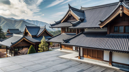 Traditional Japanese house with tiled roof and wooden structure against mountain background.