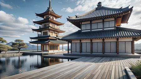 Japanese Zen Garden with Lake and Pavilion., generative AI