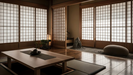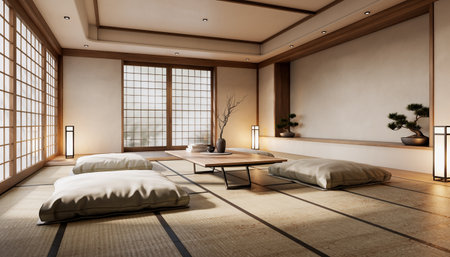 An interior view of a Japanese-style room with tatami mats, shoji screens, and minimalist decor, illustrating the elegance and simplicity of Japanese design.