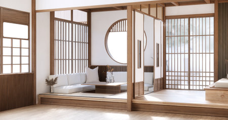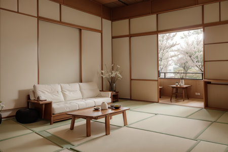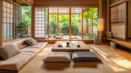 This image showcases a serene living room with Japanese architectural elements and decor. The scene features light-colored wooden panels, a neutral-toned sofa, and a low table with decorative elements. Large windows provide views of an outdoor garden, filled with natural light, offering potential for various commercial or editorial applications.