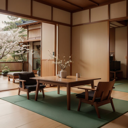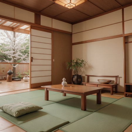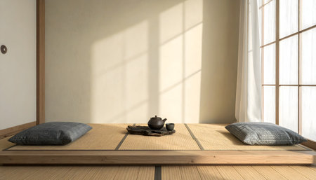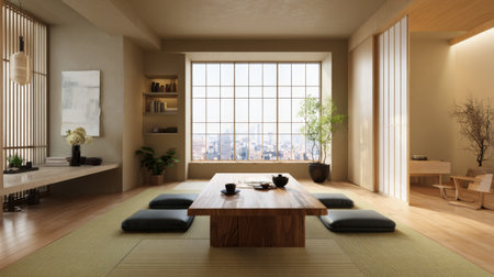 An inviting interior shot of a Japanese living room featuring tatami mats, low wooden furniture, and a simple yet elegant tea set, embodying minimalistic elegance.