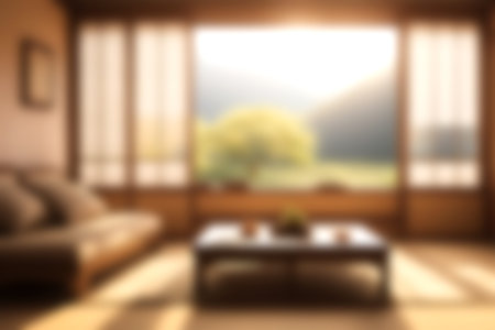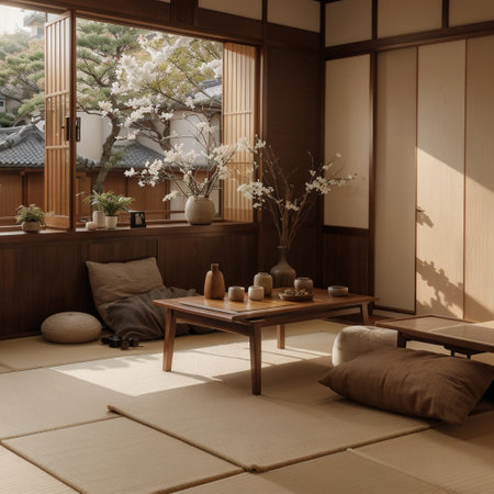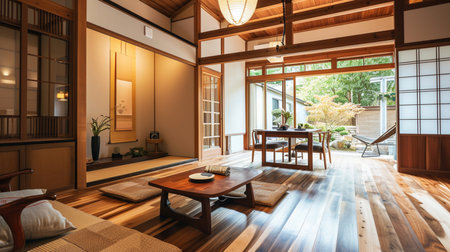A cozy interior shot of a Japanese-style living room, featuring low wooden furniture, tatami mats, and a warm, inviting atmosphere with natural light filtering through paper screens.