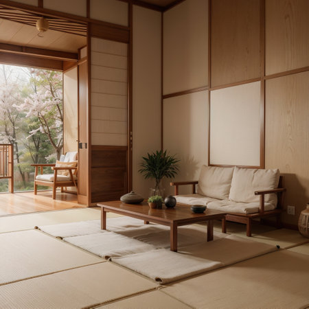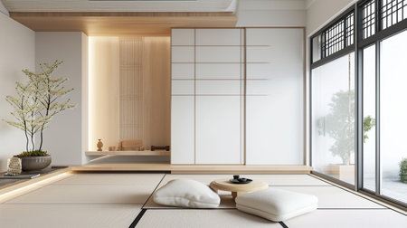 Modern Japanese interior design showcases minimalism and tranquility with soft lighting and natural materials in a serene living space
