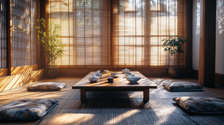 An interior shot captures a traditional Japanese space with a low table. The scene is illuminated by soft light filtering through a window. The composition features a tea set, a vase with branches, and minimalist decor. This image could be suitable for lifestyle, design, or cultural content.