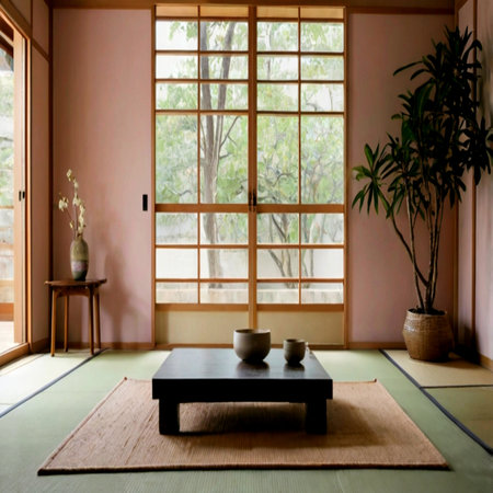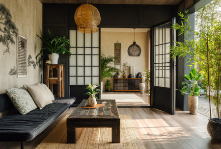 This serene interior embodies the popular Japandi style, blending Japanese minimalism with Scandinavian coziness. Sunlight subtly highlights the wooden framed windows and clean lines of the furniture, while potted plants add a vibrant touch of nature. An inviting rug and thoughtful decor elements complete this harmonious and tranquil living environment. Excellent for design portfolios, real estate, or any project emphasizing sophisticated simplicity.