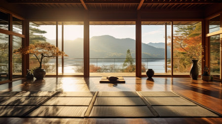 Tranquil Japanese Tea Room with Minimalist Design and Serene River