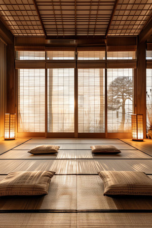 A serene Japanese room featuring tatami mats, shoji screens, and a view of a tranquil garden, creating a peaceful and minimalist atmosphere.