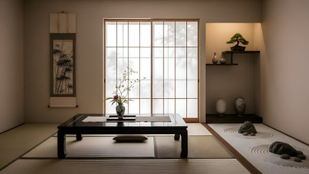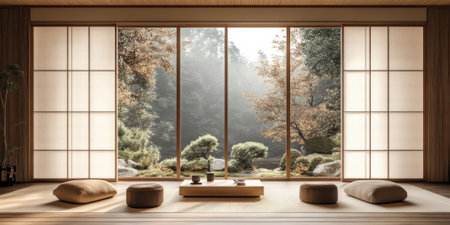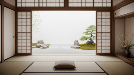 A serene Japanese tea room with a stunning view of a zen garden. The minimalist design promotes peace and relaxation, inviting meditation and tranquility.