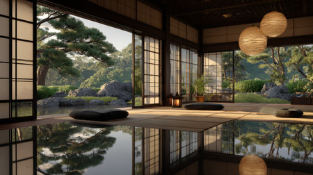 Minimal Japanese room overlooking manicured garden, featuring tatami mats, sliding doors, paper lanterns, and serene water reflections outside
