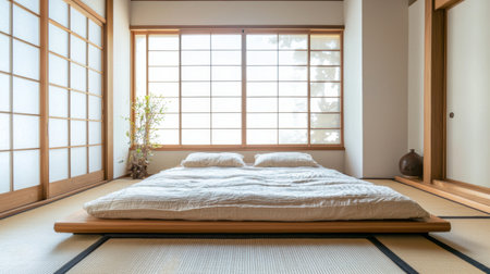 A tranquil minimalist bedroom showcasing a low bed on tatami mats, abundant natural light filtering through shoji screens, ideal for relaxation and harmony.
