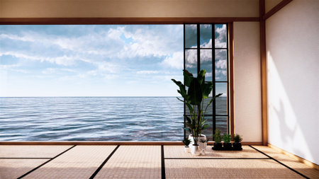 Japan room interior - Japanese style. 3D rendering in view sea.3D rendering