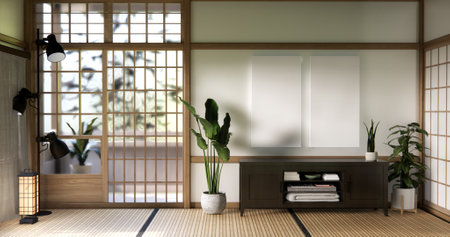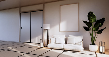 Cabinet in Living room with tatami mat floor and sofa armchair design.3D rendering