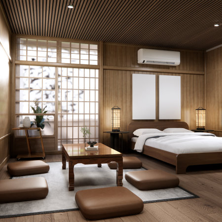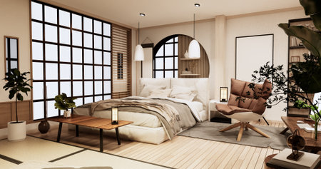 Japanese style bedroom interior design. 3D rendering. Japanese style.