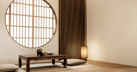 Japanese traditional low table and decoration on minimal muji room japan style.3D rendering